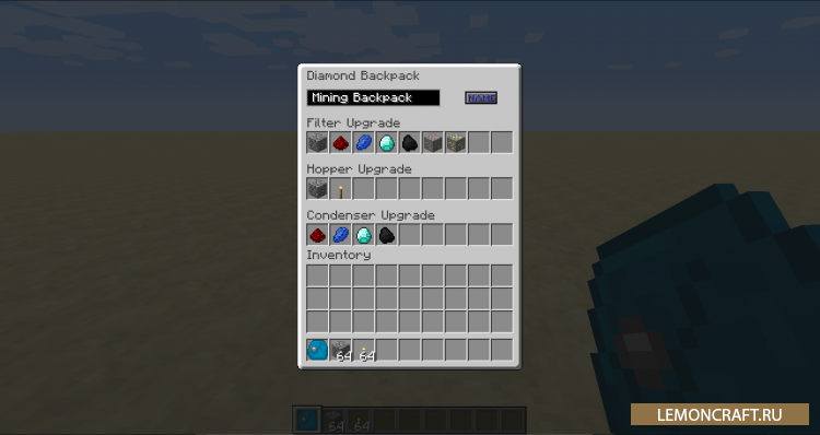 Мод добавляет в игру рюкзаки, которые можно улучшать. Например, можно поставить на рюкзак автоматическую сортировку.